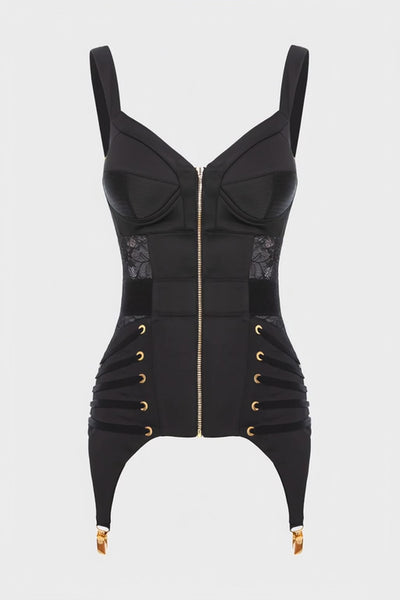 Corsetul Zest are cupe retro lucrate manual si detalii de dantela Chantilly in talie si in partea inferioara. Insertiile de insiretare inspirate de corset, plasate pe solduri, accentueaza silueta si volumele.